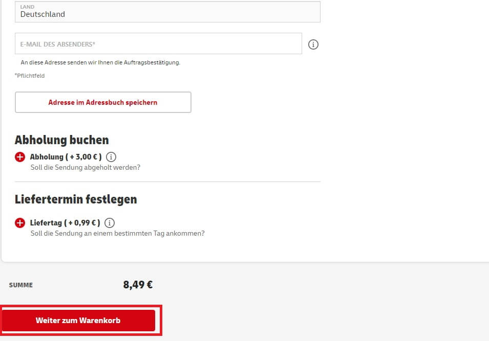 6) 해당 우편물의 수신자와 송신자의 주소 및 이름을 입력하고, 아래 부분의 'Weiter zum Warenkorb'를 클릭합니다.