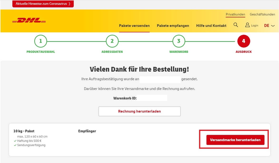 8) 해당 상품에 대한 결재가 완료되어지면, 아래의 화면으로 이동되며 해당 화면에서 'Versandmarke herunterladen'을 클릭하면 관련 DHL 송장 출력이 가능합니다.