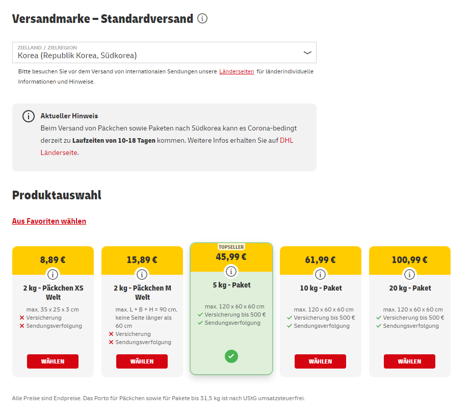 이때 배송 국가를 한국으로 선택하시면 독일 국가 외로도 DHL로 우편 또는 소포를 송부할 수 있으니 참조하시기 바랍니다.