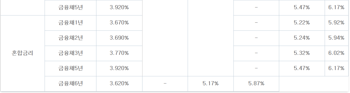 즉, 해당 주담대 금리는 기본금리와 가산금리 (0.4 ~ 2.25%)의 합에서 우대금리를 제하고 결정되는데, 기본금리의 경우 변동금리, 고정금리 그리고 혼합금리 중 선택할 수 있고 변동금리 적용 기간도 3개월, 6개월, 1년, 2년, 3년, 4년, 5년 그리고 6년 등 매우 다양하여 본인의 취향에 따라 결정할 수 있습니다.