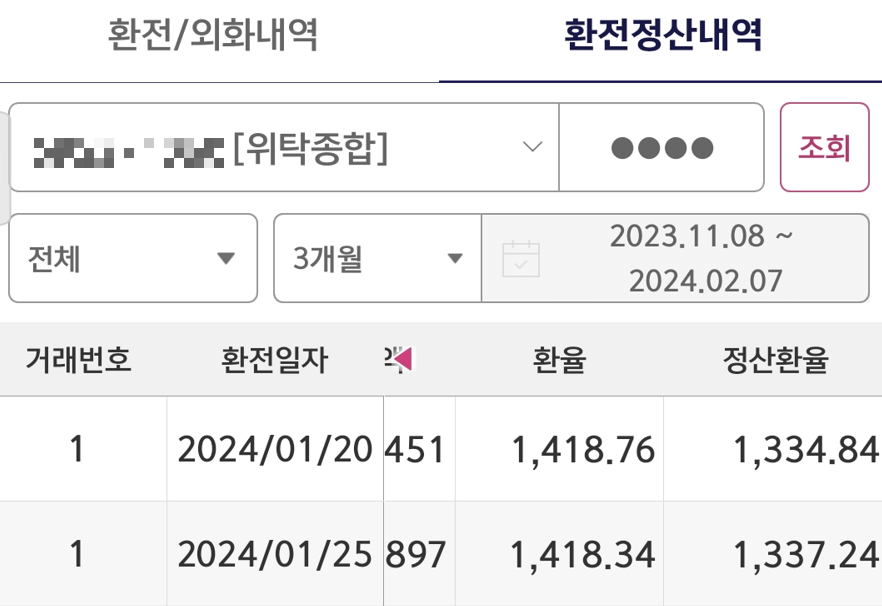 5) 키움증권 달러투자 방법을 활용하면 기존에 달러 환전 시 적용했던 매매기준율을 확인할 수 있어 편리한데, 해당 영웅문 앱에서 아래 그림과 같이 '환정정산내역' 메뉴로 이동하면 지난 과거의 환전 내역과 매매기준율을 확인할 수 있습니다.