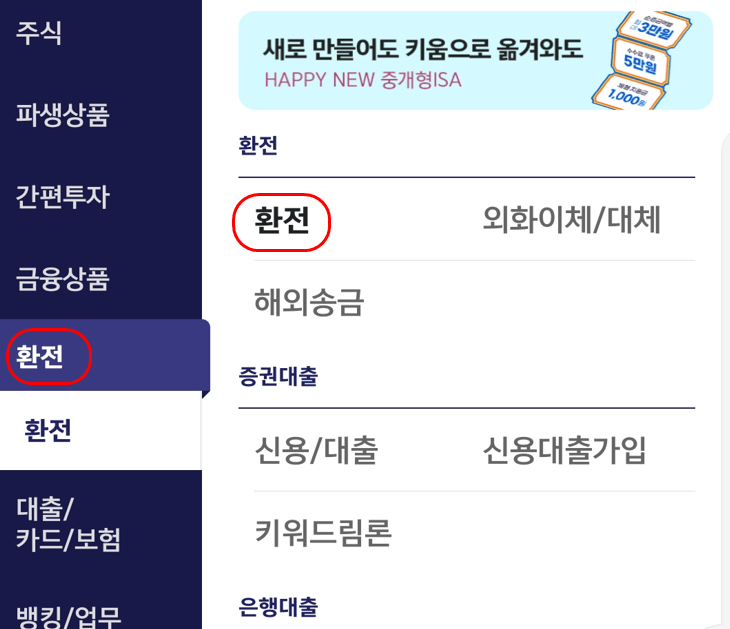2) 키움증권 영웅문앱을 설치하셨다면 해당 앱에 로그인 한 후 아래 그림과 같이 '환전' 메뉴로 이동합니다.