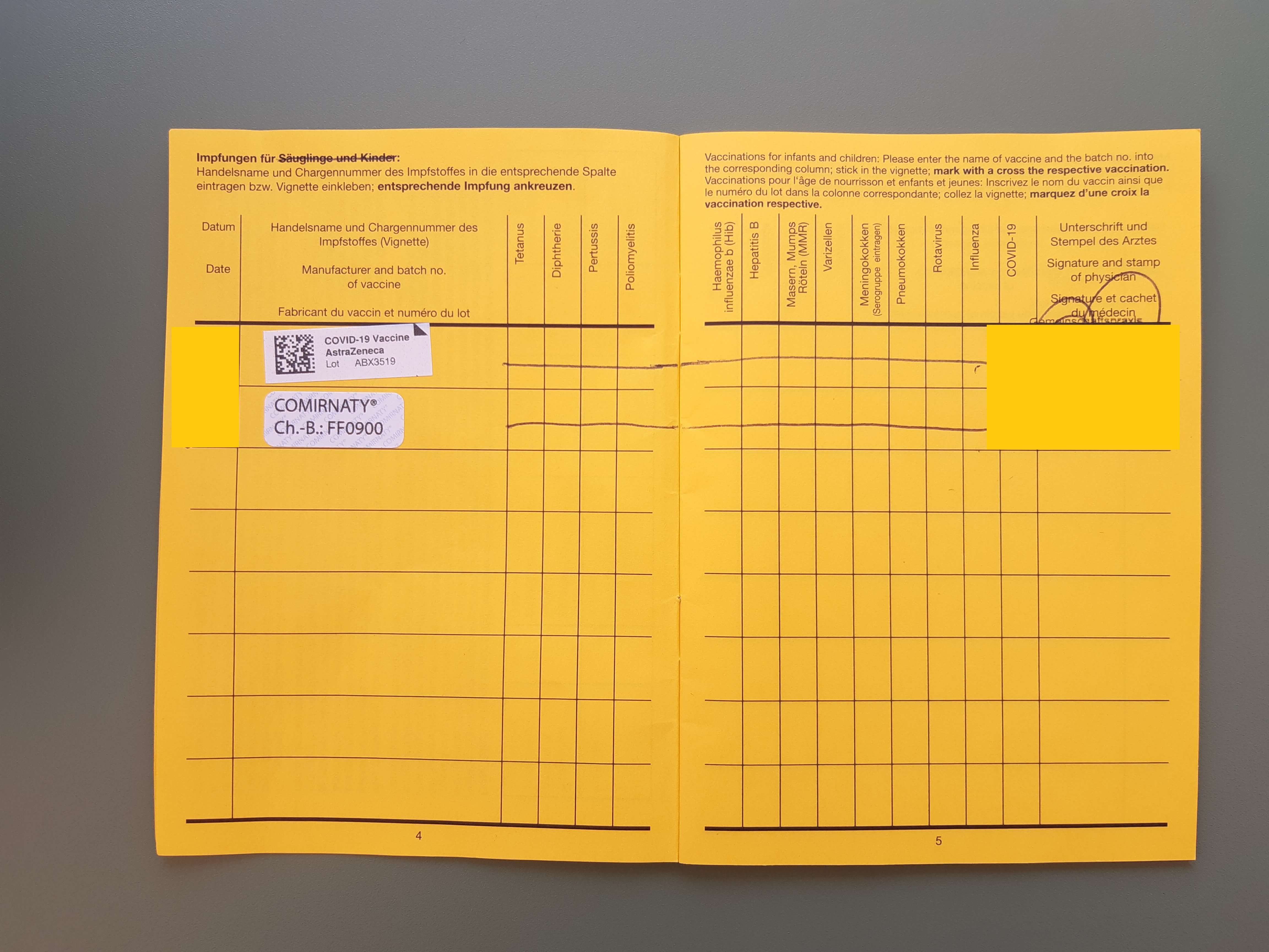 독일의 경우, 아래와 같은 노란색 바탕의 작은 책자같은 것이 코로나 백신뿐 아니라 기타 여러 백신 접종의 확인서로 활용되며 코로나 백신 접종 후 병원에서 발급해 주고 있습니다.