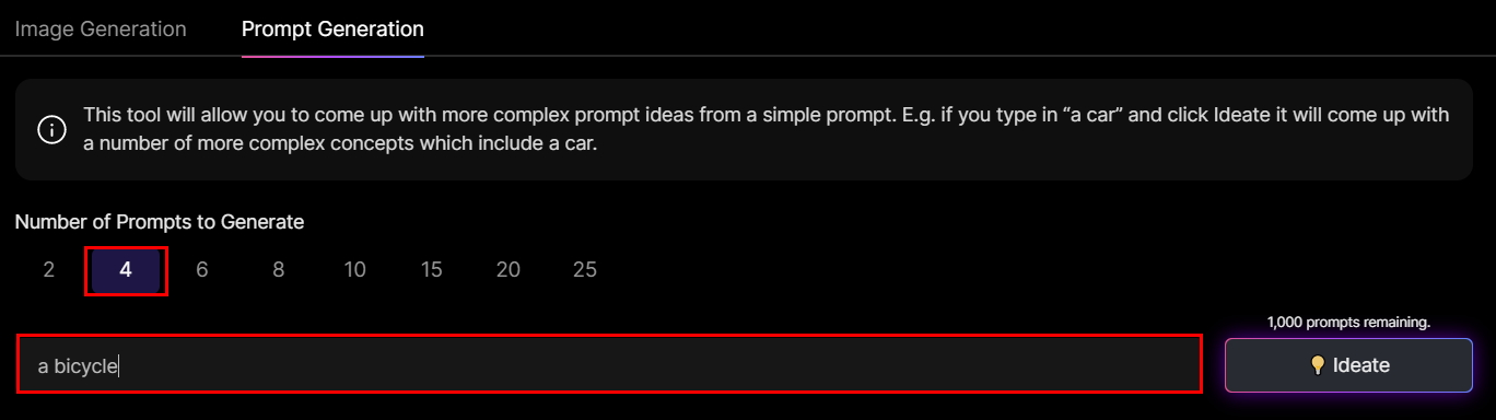 텍스트 프롬프트 아이디어를 얻으시려면 아래 그림과 같이 'Prompt Generation' 메뉴로 이동하신 후 생성할 텍스트 프롬프트의 갯수와 함께 텍스트 프롬프트에 사용될 주요 단어 (아래 예제: a bicycle)를 작성하시고 'ideate' 버튼을 클릭하시면 됩니다.