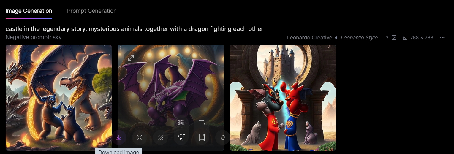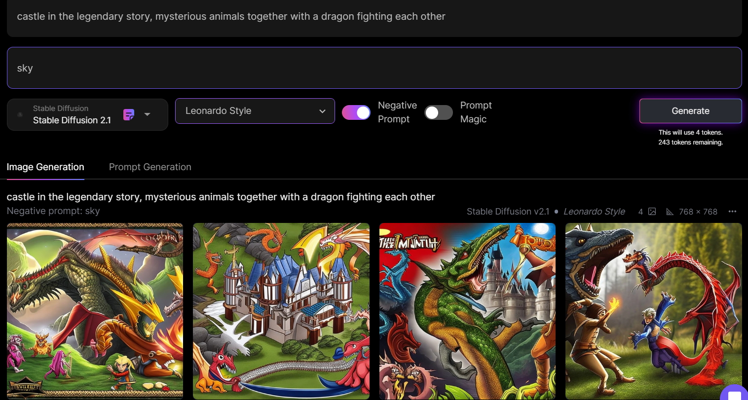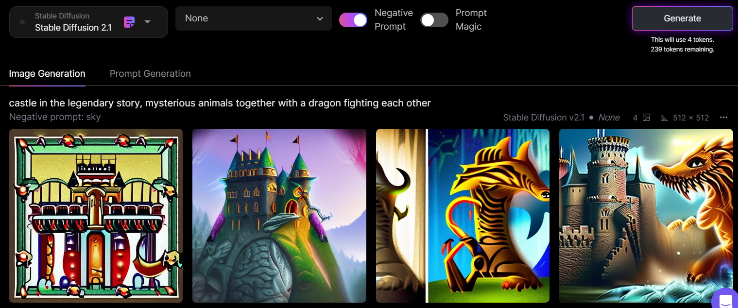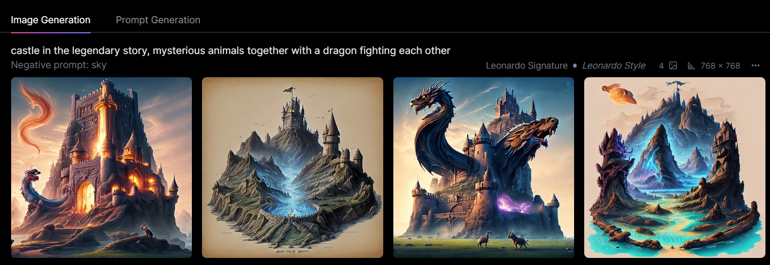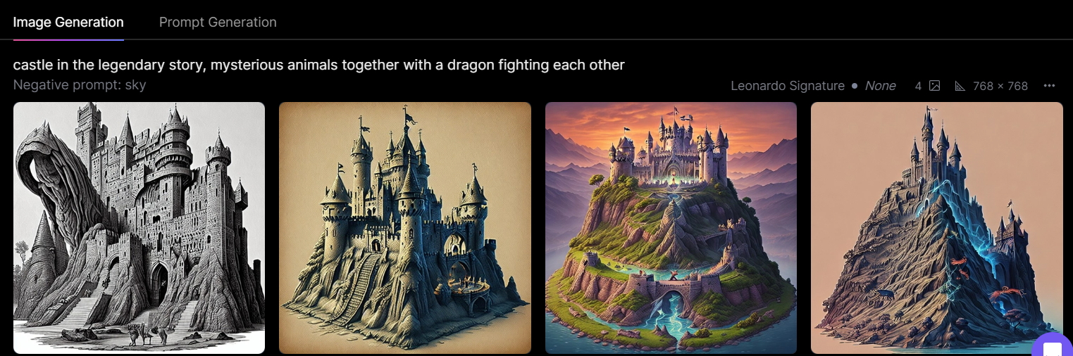 아래의 예제에서는 전설의 성에서 용과 동물들이 싸우는 장면에 대한 ai 이미지를 생성하기 위한 텍스트 프롬프트를 작성한 것이며 해당 이미지에 하늘을 제거해 줄 것을 요청하였습니다.