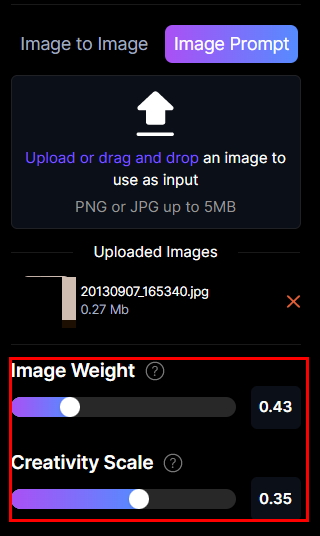 image weight의 값이 높을수록 작성하신 텍스트 프롬프트에 보다 가까운 ai 이미지가 생성되고 값이 낮을수록 업로드하신 사진에 가까운 ai 이미지가 생성됩니다.
