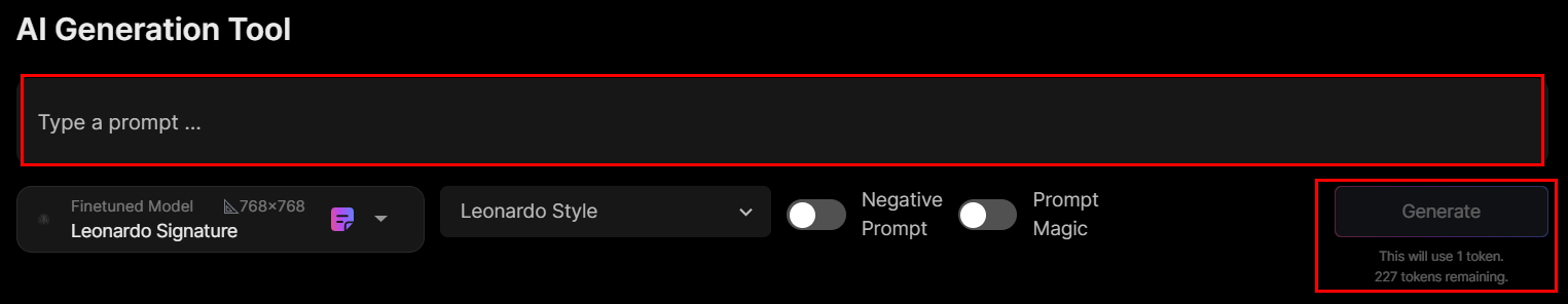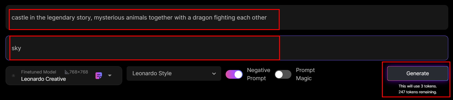 3. 레오나르도 ai 사용법은 미드저니와 유사하나 보다 심플하게 텍스트 프롬프트만을 사용하는데, 아래의 빨간색 텍스트 창에 원하시는 이미지에 대한 설명을 작성하시고 (영문), 'Generate' 버튼을 클릭하시면 입력한 프롬프트에 해당하는 ai 이미지를 생성하실 수 있습니다.