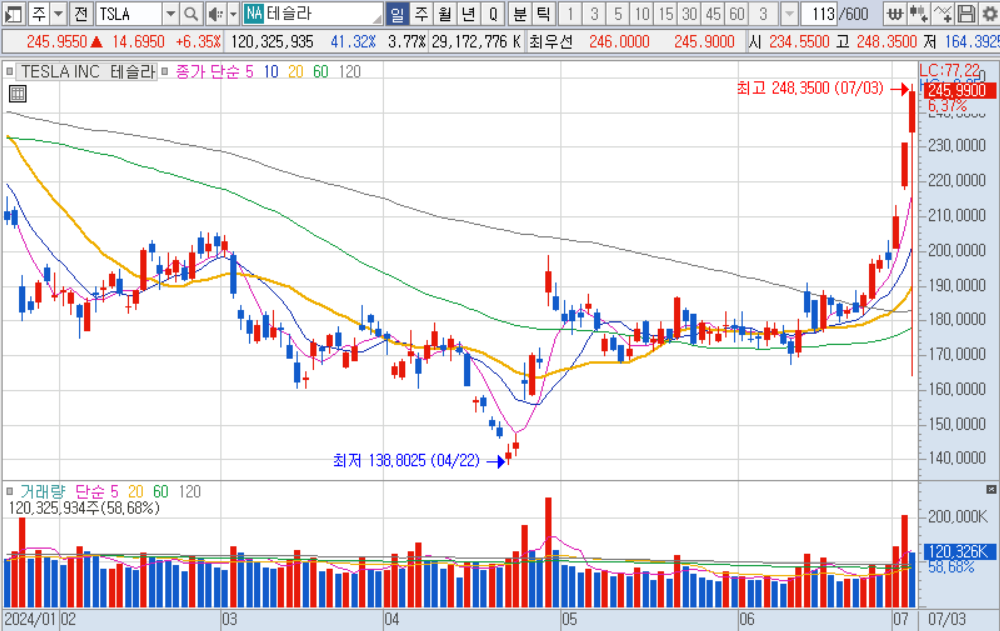 7월 3일 기준 테슬라 주가는 246달러로 마감되었는데, 지난주까지만 해도 200달러는 매우 힘든 허들처럼 느껴졌으나 해당 매물대를 통과한 이후 매우 가파른 모습으로 상승하고 있으니 참고하시기 바랍니다.