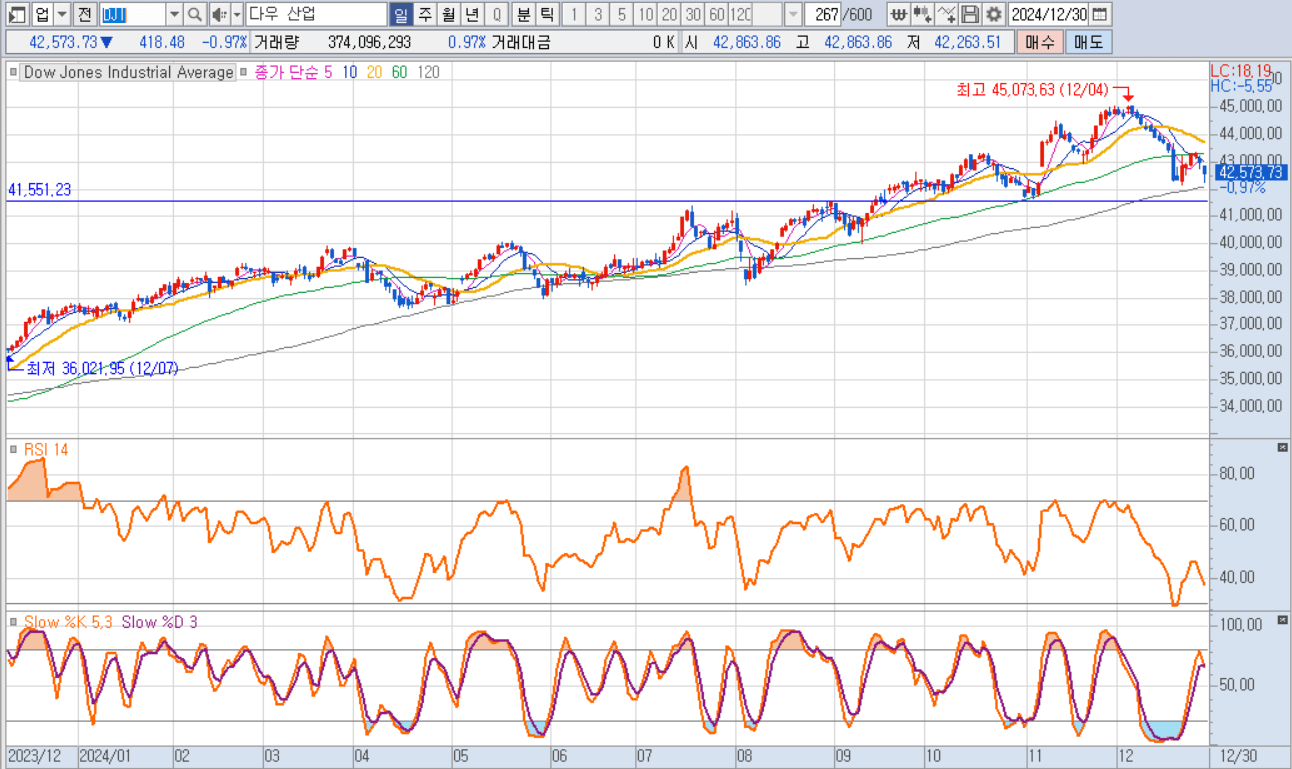 다우 지수의 경우에도 상황은 나스닥 지수와 별반 다르지 않은데, 12월 30일 기준 나스닥 지수는 43,573을 기록하고 있습니다.