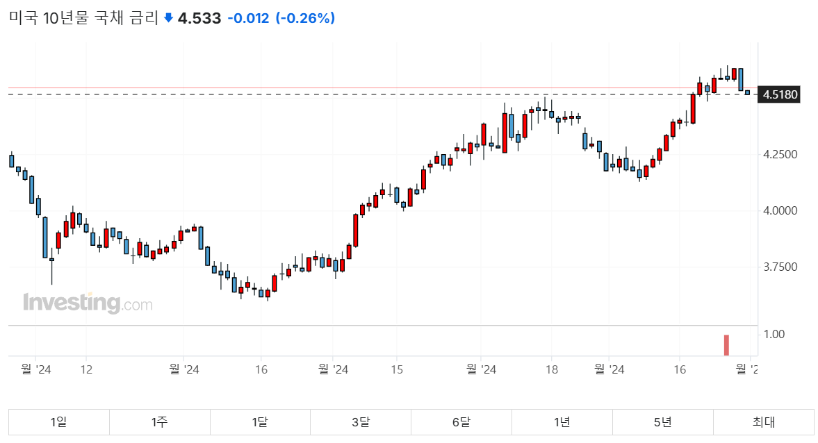 이번 포스팅에서는 2024년 말 미국증시 나스닥 조정이 발생하고 있는 상황과 이러한 조정의 원인이 미국채 10년물 금리 인지에 대하여 짧게 살펴보도록 하겠습니다.