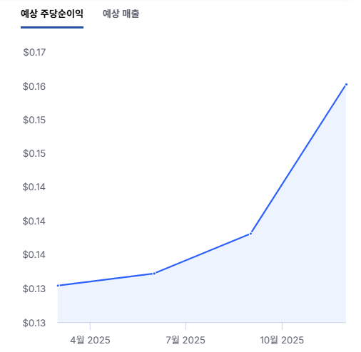 팔란티어의 경우 1분기 실적예상뿐만 아니라 향후 가이던스 또한 나쁘지 않을 것으로 보이는데, 아래 2025년 주당순이익 추이를 살펴보면 2025년 하반기에는 0.16달러를 넘어 올 한해만에도 20%가 넘는 성장세를 나타낼 것으로 예측되고 있으니 참고하시기 바랍니다.