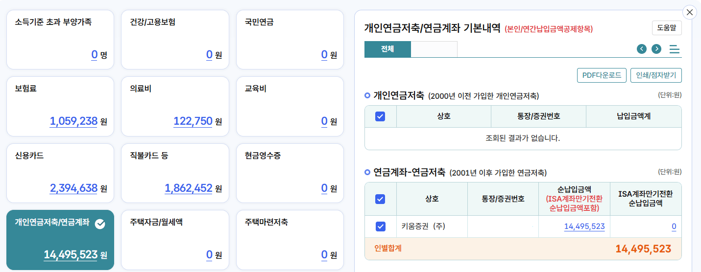 위 화면에서 각 항목을 선택하면 연말정산 간소화서비스 오른편에 상세내역과 금액이 표기되며 각 문서를 '내려받기' 기능을 통하여 다운로드할 수 있으니 참고하시기 바랍니다.