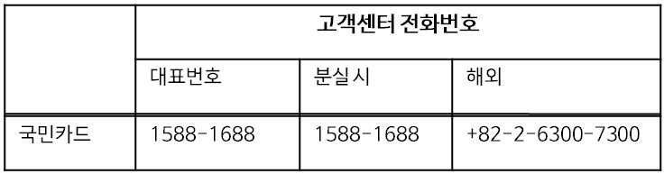 마지막으로 국민카드의 경우 국민카드 고객센터 전화번호는 1588-1688번이며 해외에서 국민카드 고객센터를 이용하시려면 +82-2-6300-7300을 활용하시면 됩니다.