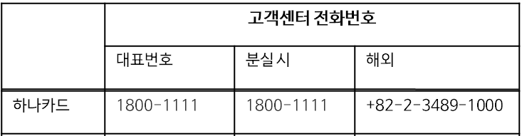 0) 하나카드 고객센터 / 분실신고: 1800-1111