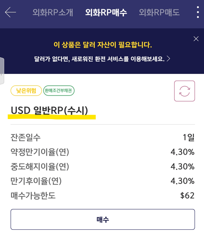 즉, 현재 보유하고 있는 달러가 있다면 해당 달러를 외화 rp 통장에 넣어두고 약정된 이율의 달러를 받음으로써 추가적인 달러를 확보할 수 있는 것입니다.