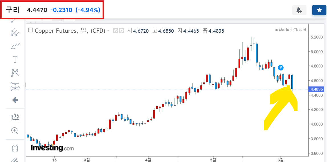 국제 구리시세의 경우 국제 은시세보다는 낮은 하락률을 보였으나 6월 7일 5%에 가까운 하락으로 마감하였습니다.