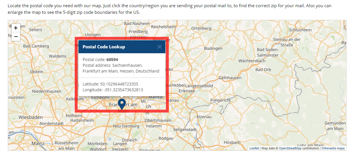 일례로, 아래에 'Frankfurt 내의 특정 사무실 위치'를 검색하면 지도상에서의 위치와 함께 우편 번호 '60313'이 표기되는 것을 확인하실 수 있습니다.