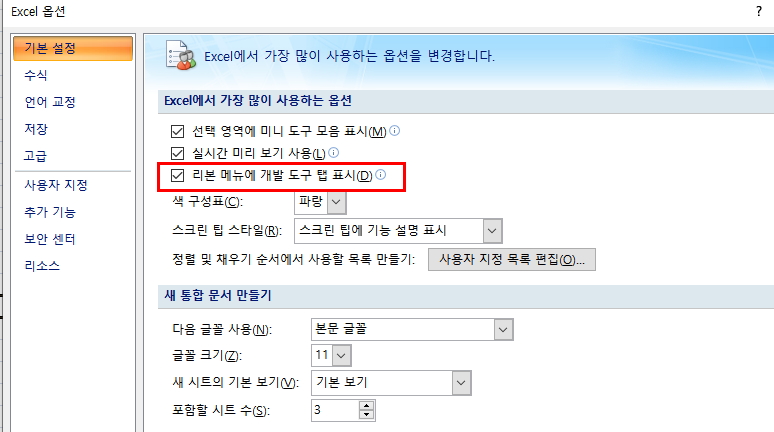 4) 엑셀을 열어 '엑셀 옵션 → 기본설정'에서 '리본 메뉴에 개발 도구 탭 표시'를 선택해 줍니다.