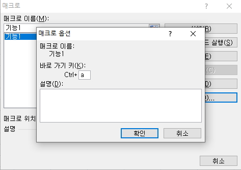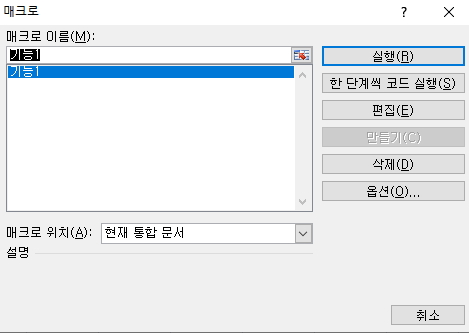 8) 아래와 같이 '기능1' 이라는 엑셀 매크로 만들기가 완료된 것을 확인할 수 있으며, 여기서 '옵션'이라는 항목을 선택하시고 바로 가기 키에 영문자 a를 입력하시면, 추후에 'Ctrl + a'를 클릭하실 때마다 '기본 1'이라는 매크로가 자동 실행됩니다.