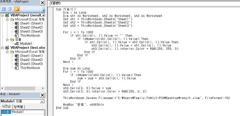 5) 마지막 결과를 'result.xlsm'라는 파일 이름으로 바탕화면 (C:\Users\Family.FAMILY-PC0\Desktop)에 저장.