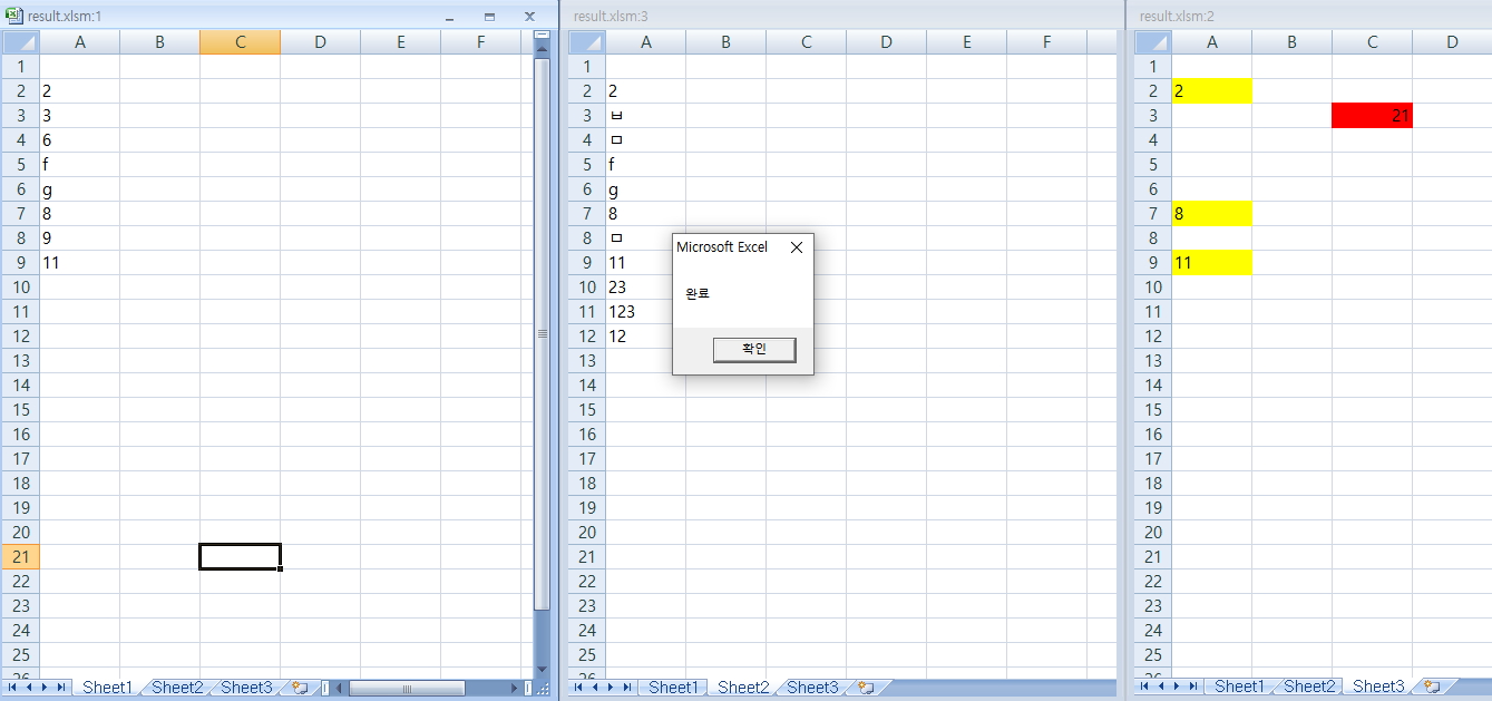 sheet3의 동일한 a row의 위치로 그 값을 옮기고, 값을 옮긴 셀의 색상을 노란색으로 변경.