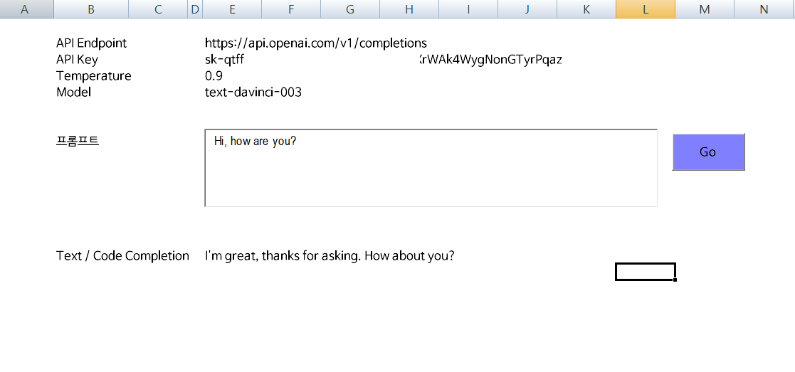 즉, 엑셀에서는 vba를 통해 프로그래밍을 진행하여 챗gpt와 통신을 구현하고 이 때 챗gpt의 API Endpoint와 사용할 API Key를 알려줌으로써 엑셀에서 수행하는 프롬프트가 챗gpt API에게 전달될 수 있으며, 챗gpt에서는 알려준 API 키에 할당된 토큰을 사용하여 text completion 또는 code completion을 수행한 후 해당 결과를 엑셀로 다시 돌려주는 것입니다.