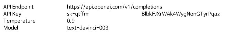API End point의 경우 위의 예제와 동일하게 작성하셔도 무방하나, API 키는 각자 사용하시는 키로 대체하여 작성하셔야 하며, Temperature나 모델은 본인 취향에 맞게 선정하시면 됩니다.