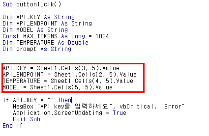4) 아래 엑셀 vba 코드에서 확인하실 수 있듯이 API 키, API Endpoint, Temperature 그리고 Model 값을 엑셀 어플리케이션 화면의 입력 값에서 입력받아 이를 챗gpt API에게 전달함으로써 엑셀에서 다이렉트로 챗gpt를 사용할 수 있습니다.