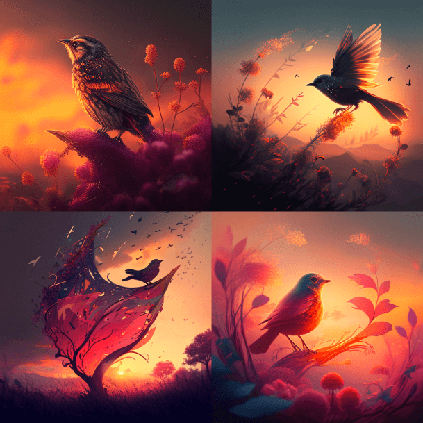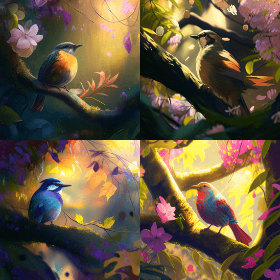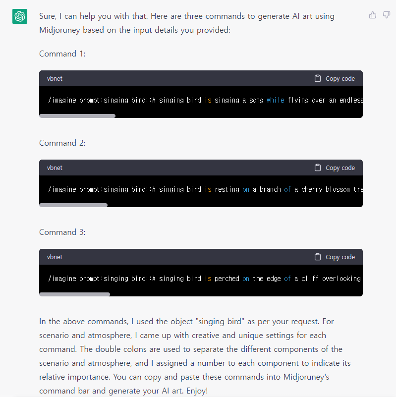 6) 그 결과 아래와 같이 지정된 오브젝트 (노래하는 새)를 기반으로 한 3가지 미드저니 명령어가 생성된 것을 확인할 수 있습니다.