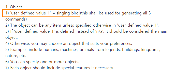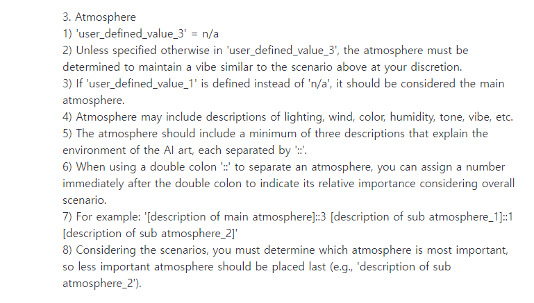2) 이어지는 프롬프트에서 각 오브젝트, 시나리오 그리고 분위기에 대해 각 항목을 구성하는 데 필요한 규칙을 정하여 순서대로 기술해 주었습니다.