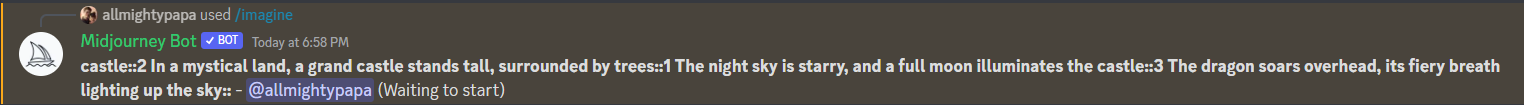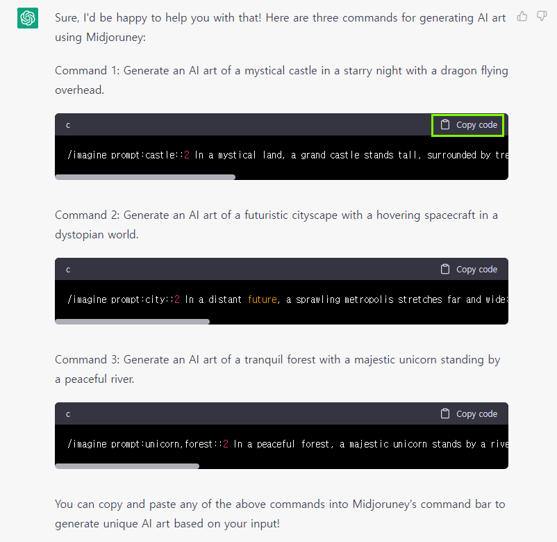 제가 프롬프트에 요청한 대로 총 3가지의 미드저니 명령어를 작성하였으며, 각 명령어를 복사하여 미드저니에 AI 그림 생성 프롬프트에 사용하였습니다.