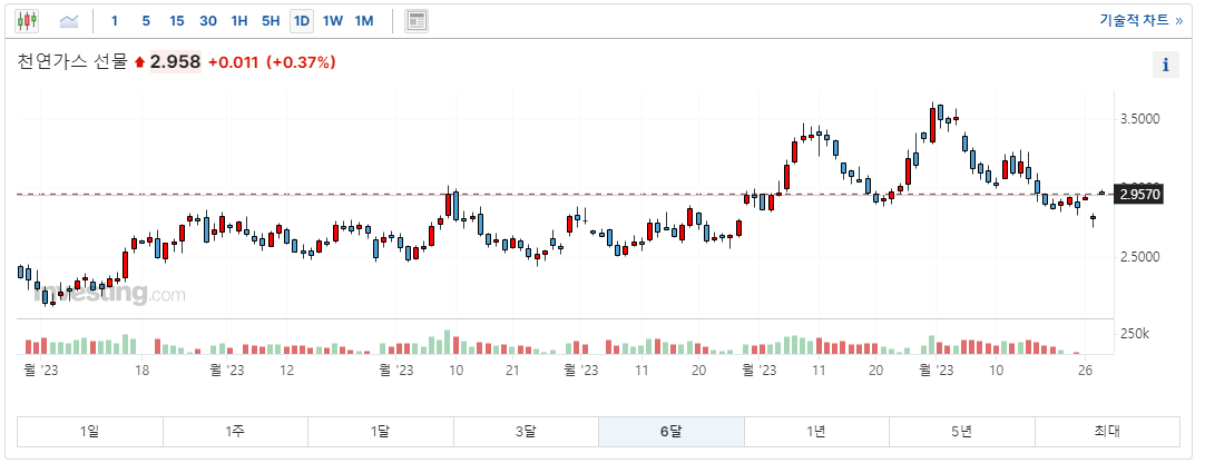 2023년 11월 28일 현재 천연가스 선물 가격은 1MMBtu당 2.962달러로 이는 지난 1년을 통해 보았을 때 약 57% 하락한 것임을 알 수 있습니다.