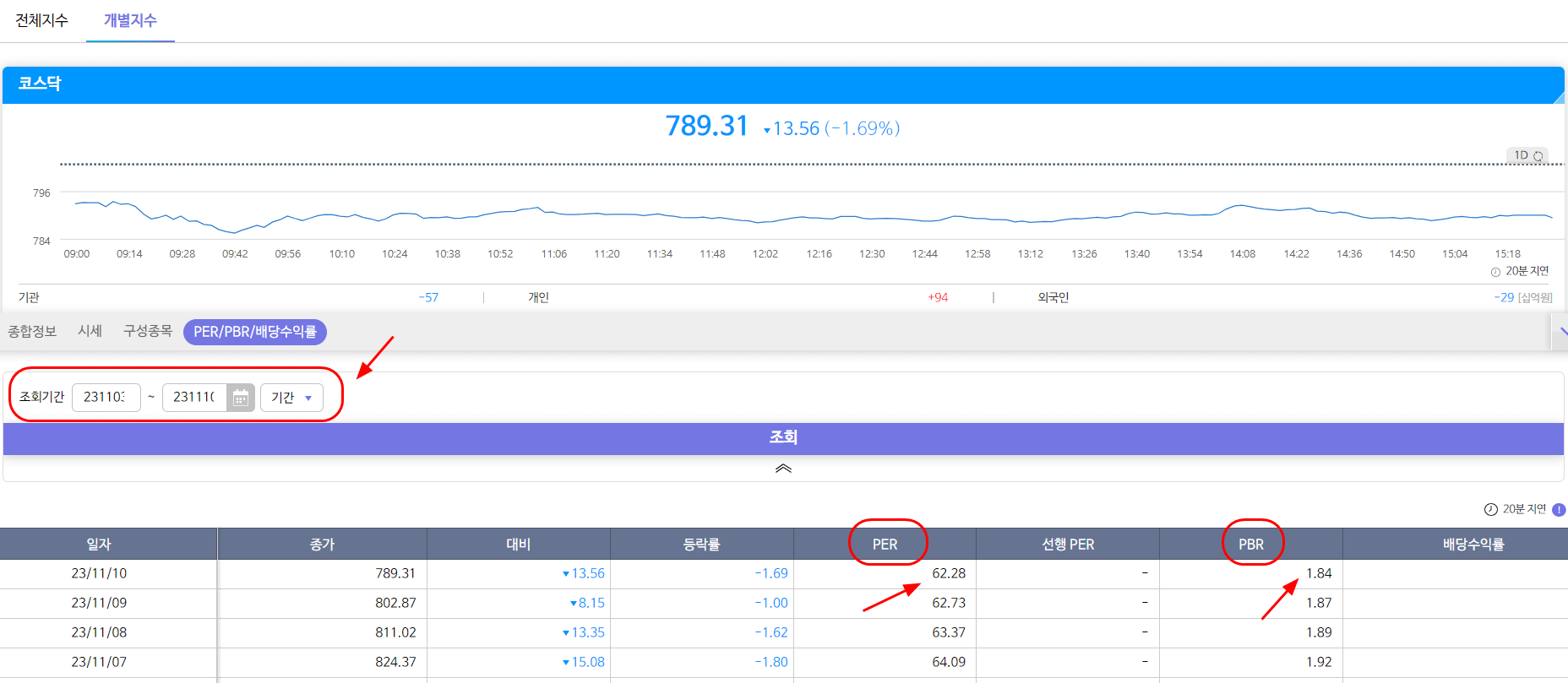 2023년 11월 10일 기준 코스닥 per는 62.28이며 코스닥 pbr은 1.84로 이는 per10과 pbr 1을 모두 상회하고 있음을 알 수 있습니다.