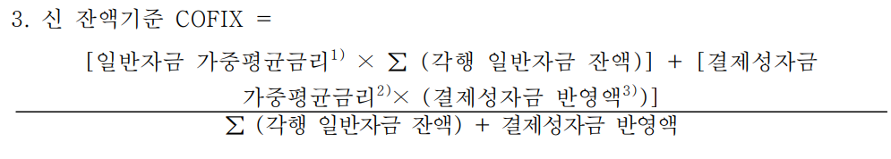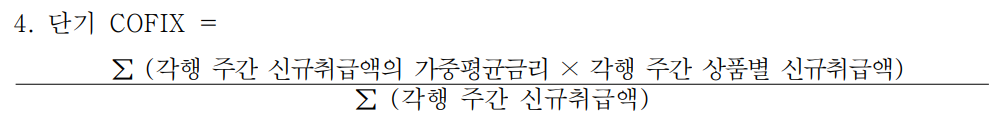마지막으로 단기 코픽스 금리의 경우 각 은행이 주간 신규로 취급한 만기 3개월의 금융 상품의 자금조달지수를 계산한 것으로 단기 코픽스 기준금리 계산 공식은 아래와 같으니 참고하시기 바랍니다.