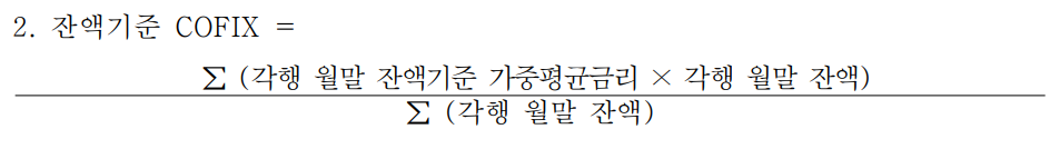 다음으로 코픽스 잔액기준이란 지난 기간 동안 판매하여 자금을 조달한 상품 중 해당 월에 아직 잔액이 은행에 남아있는 것들을 기준으로 조달비용지수를 산출한 것으로, 코픽스 잔액 기준 산출공식은 아래와 같습니다.