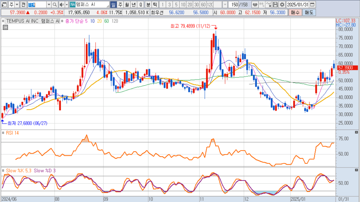 템퍼스 ai 주가는 2월 1일 기준 57달러를 기록하고 있는데 2025년에 들어서며 낸시 펠로시가 투자한 사실이 알려지면서 상승세가 지속되고 있습니다.