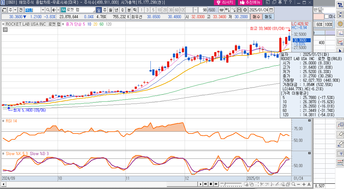 로켓랩 주가의 경우 2025년 1월 24일 기준 30.36달러를 기록하고 있는데, 지난 화요일 무려 30%가 넘는 상승을 한 뒤 다소 쉬어가는 모습을 보여주고 있습니다.