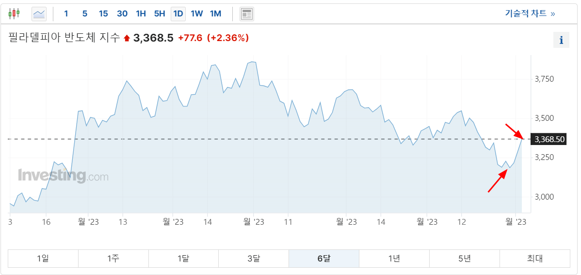 필라델피아 반도체지수는 미국 반도체 기업을 대표하는 지표 중 하나로 삼성, 하이닉스를 비롯한 국내 반도체 기업들의 주가와 매우 밀접한 연관이 있습니다.