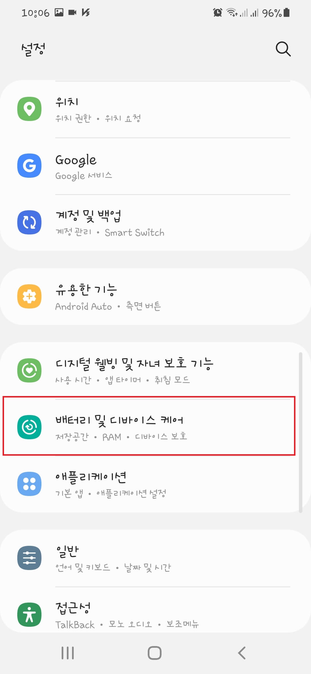 2) '배터리 및 디바이스 케어' 메뉴를 클릭합니다.