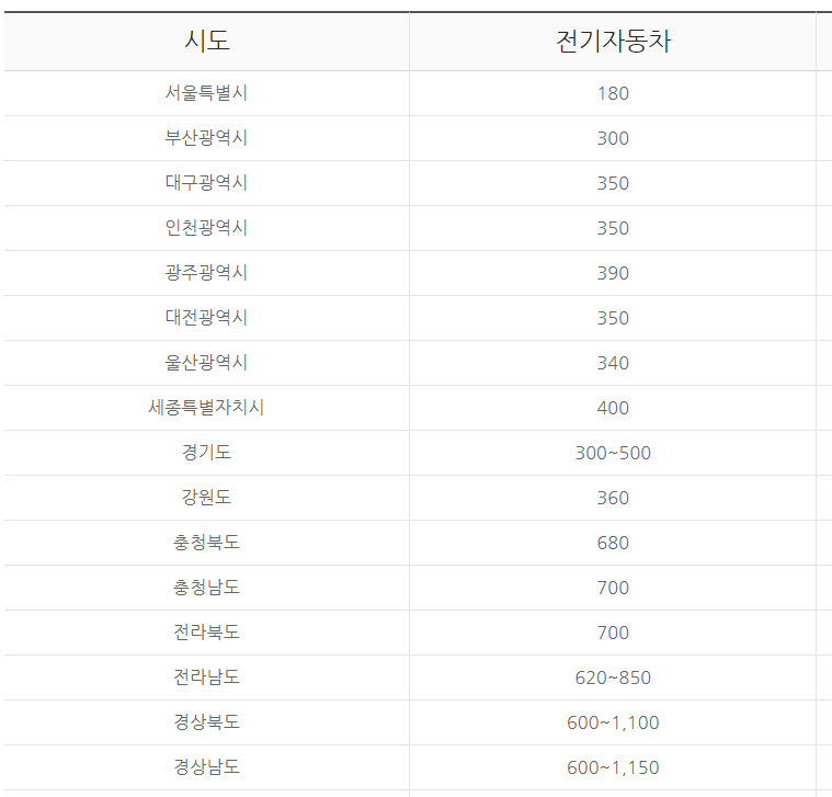 2023년 전기차보조금의 경우 지역별로 상이하게 재공되는데, 서울특별시 전기차보조금은 가장 낮은 180만원이며 가장 많은 전기차보조금을 지급하는 지역은 경상남도와 경상북도로 최대 천만원이 넘는 전기차보조금을 지급하는 것으로 나타나 있으니 참고하시기 바랍니다.