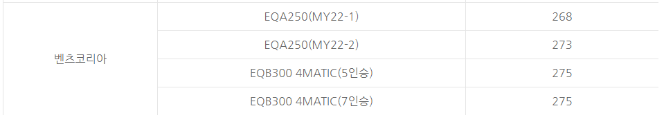 벤츠의 2023 전기차보조금은 대략 270만원대를 이루고 있으며 차종별 상세 내역은 아래 테이블과 같습니다.