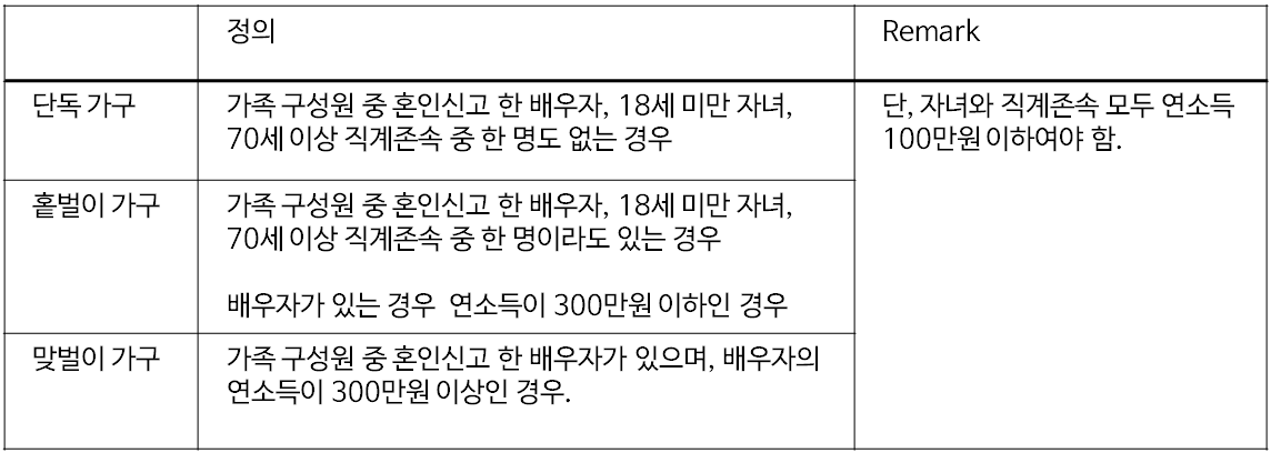 1) 가구원에 대한 조건 (단독가구, 홑벌이 가구, 맞벌이 가구)