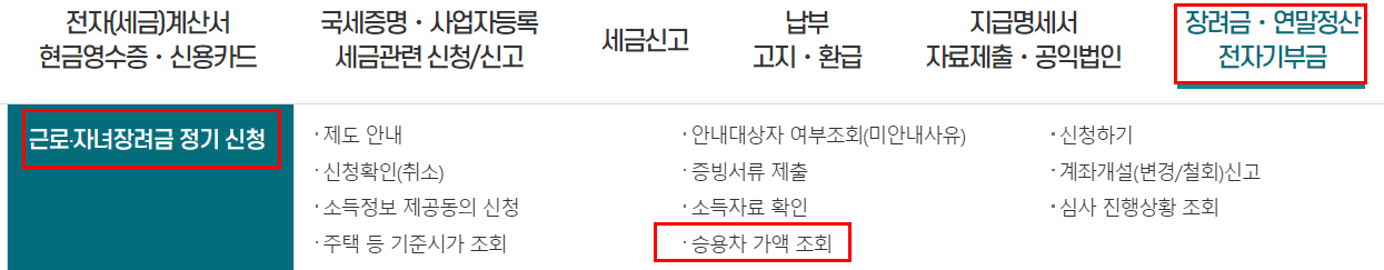 자동차 가액의 경우 홈텍스 내 '근로 자녀장려금 정기 신청' 메뉴 아래 '승용차 가액 조회' 메뉴를 통해 직접 조회해 보실 수 있습니다.