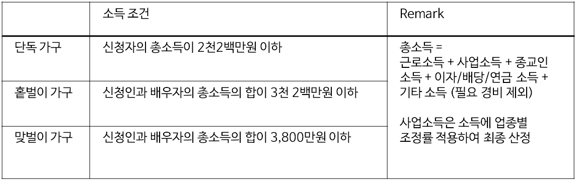 따라서 가장 먼저 가구원에 대한 조건을 살펴보고 이를 통해 해당 가구가 단독가구인지, 홑벌이 가구인지 또는 맞벌이 가구인지의 여부를 파악한 후 소득에 대한 조건과 재산에 대한 조건의 충족 여부를 살펴보아야 합니다.
