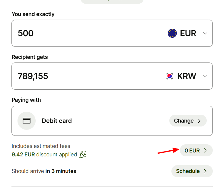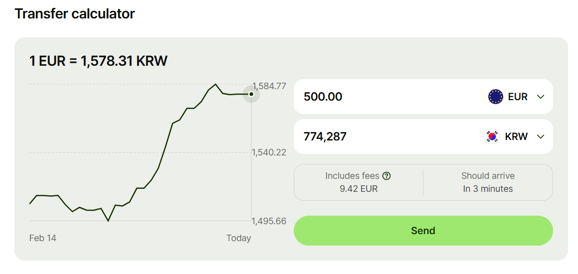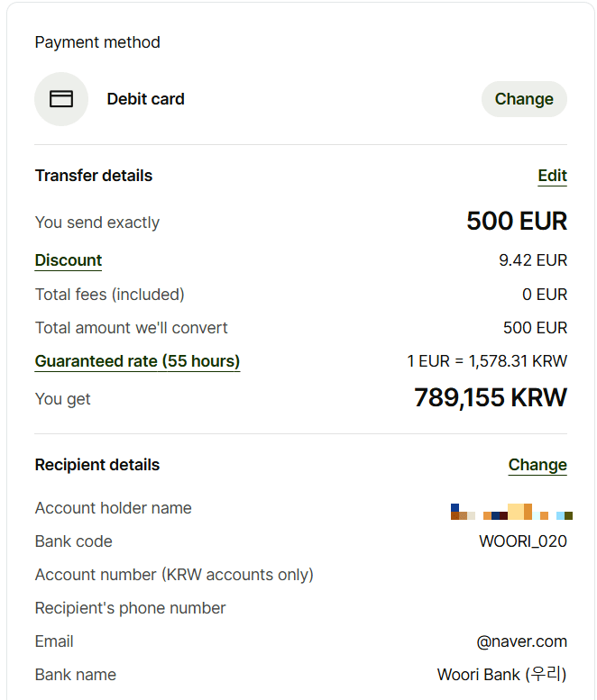 Wise 수수료의 경우 송금하는 금액에 따라 달라지는데, 500유로 송금시는송금 시는 약 1.8%의 해외송금 수수료가 5000유로 송금 시는 약 0.73%의 수수료를 지불하게 됩니다.