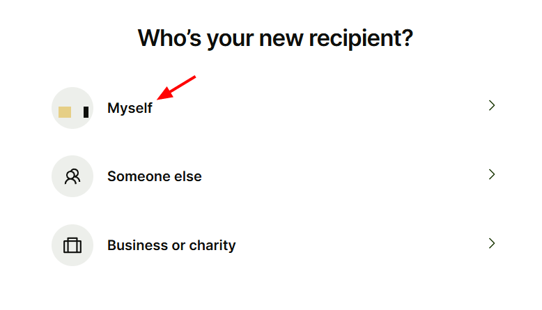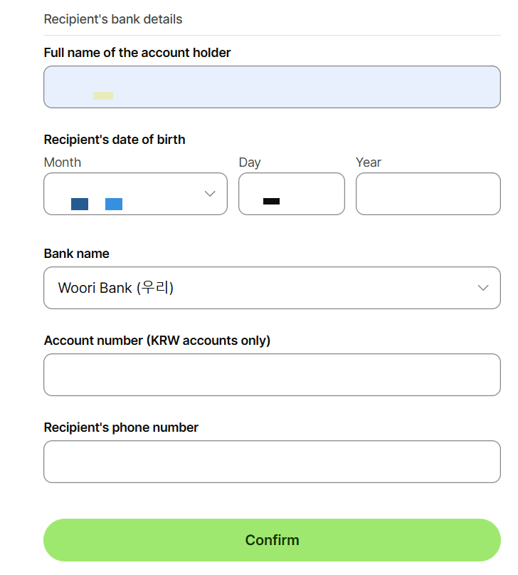 즉, 이어지는 화면에서 해외송금을 받는 사람이 본인인지 (myself) 다른 사람인지를 선택하신 후 수신인의 은행, 계좌번호와 생년원일 그리고 연락처를 기입하시면 됩니다.