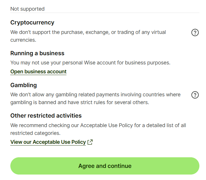 3) 다음 화면에서는 Wise 해외송금 서비스 가입 시 일반적인 사항과 주의사항에 대한 설명이니 읽어보시고 'continue' 버튼을 클릭하시면 됩니다.