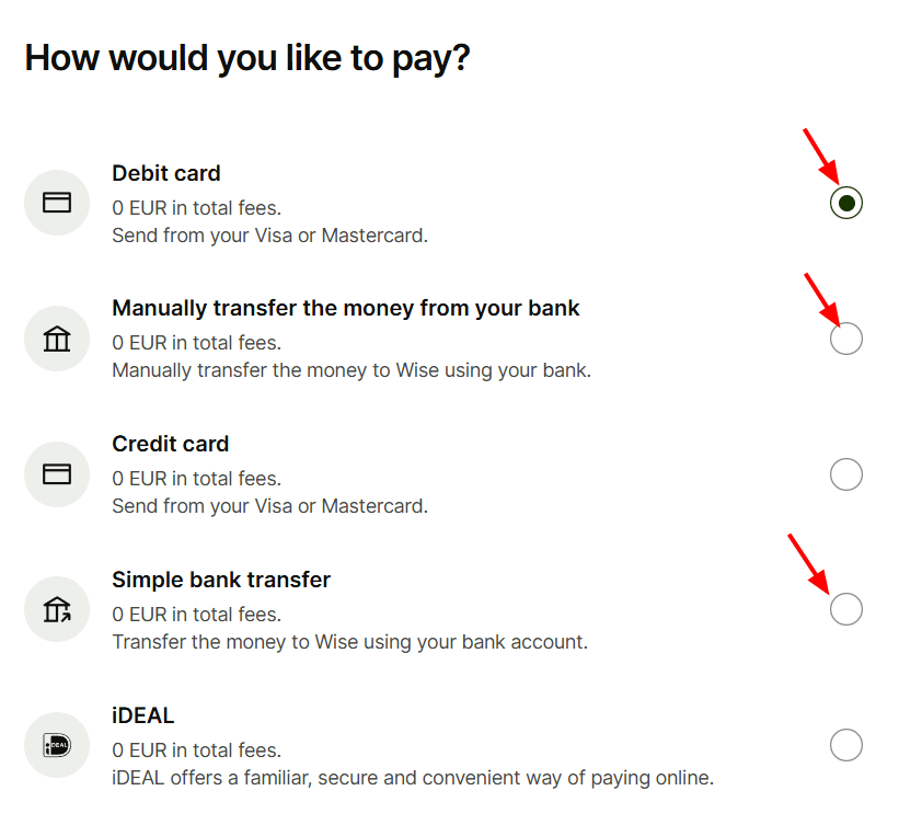 Wise 해외송금 서비스에서는 아래와 같이 다양한 방법으로 해외송금 수수료 및 송금 금액을 지불하는 수단을 지원하는데, 보유하고 계신 카드로 지불할 수도 있고 직접 wise 계좌로 이체를 해도 무방합니다.