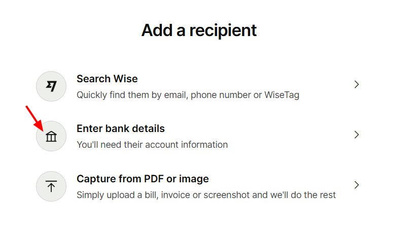 3) 위 단계를 마치셨다면 Wise 송금 방법 세번째는 수신인을 작성하는 것으로, 아래와 같이 'Enter bank details'를 선택하신 후 관련 내용을 기입하시면 됩니다.