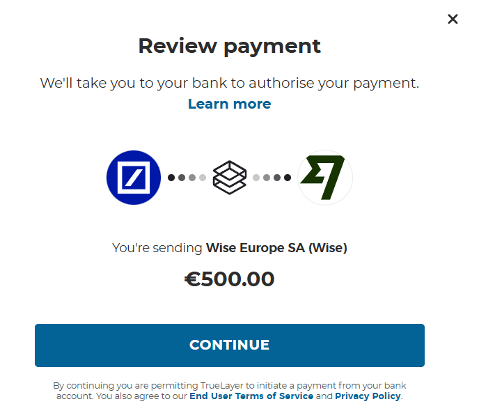 결제 방법 중 'simply bank transfer'를 선택하면 아래와 같이 보유하고 계신 해외 계좌를 연결할 수 있도록 절차가 진행되며 만약 Wise 송금 수수료가 발생한다면 해당 해외송금 수수료가 포함되어 결제 금액에 반영되니 참고하시기 바랍니다.